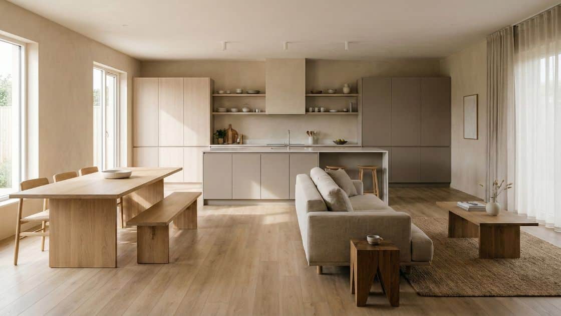 Doorlopende lichte PVC vloer in Japandi open keuken en woonkamer
