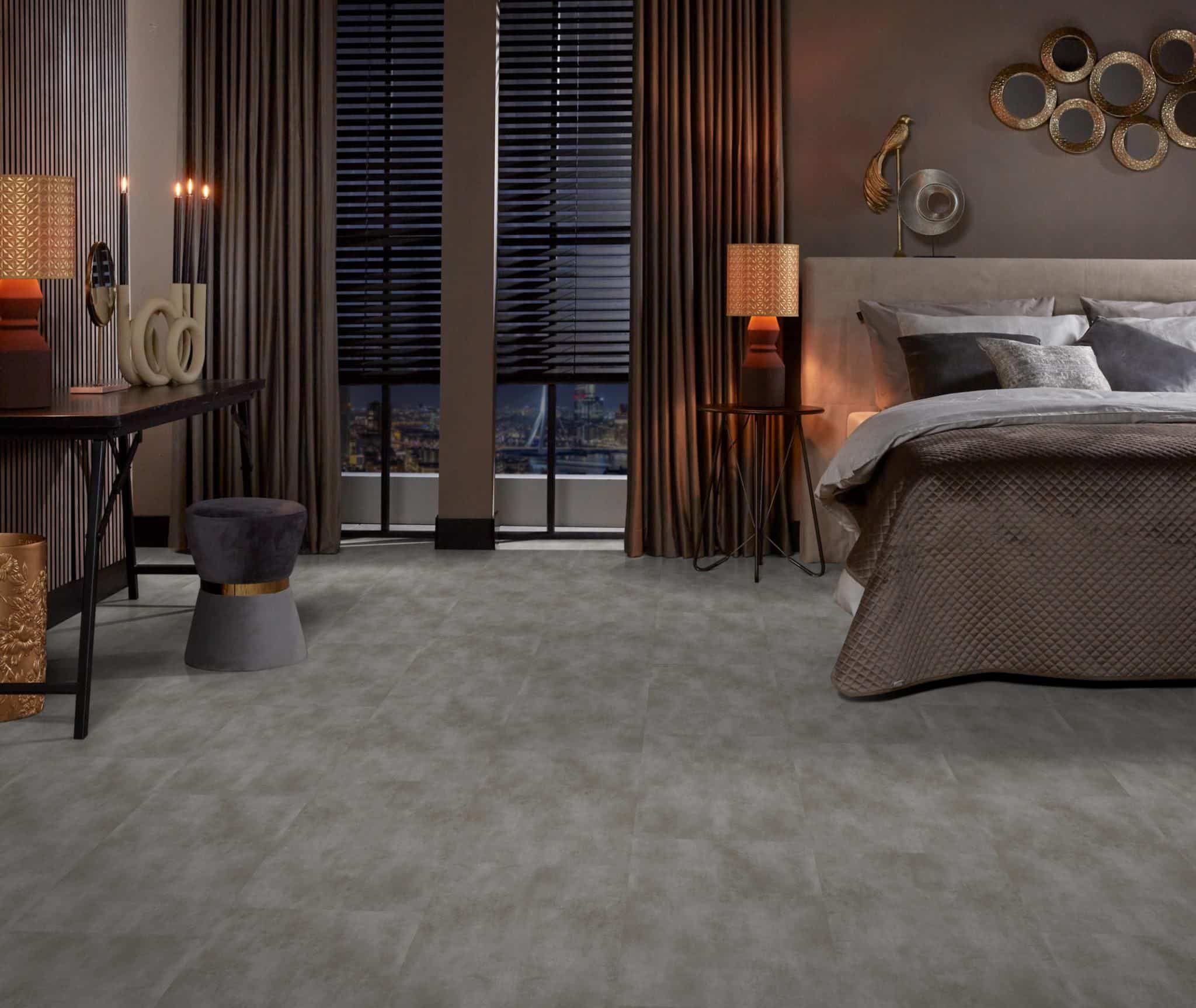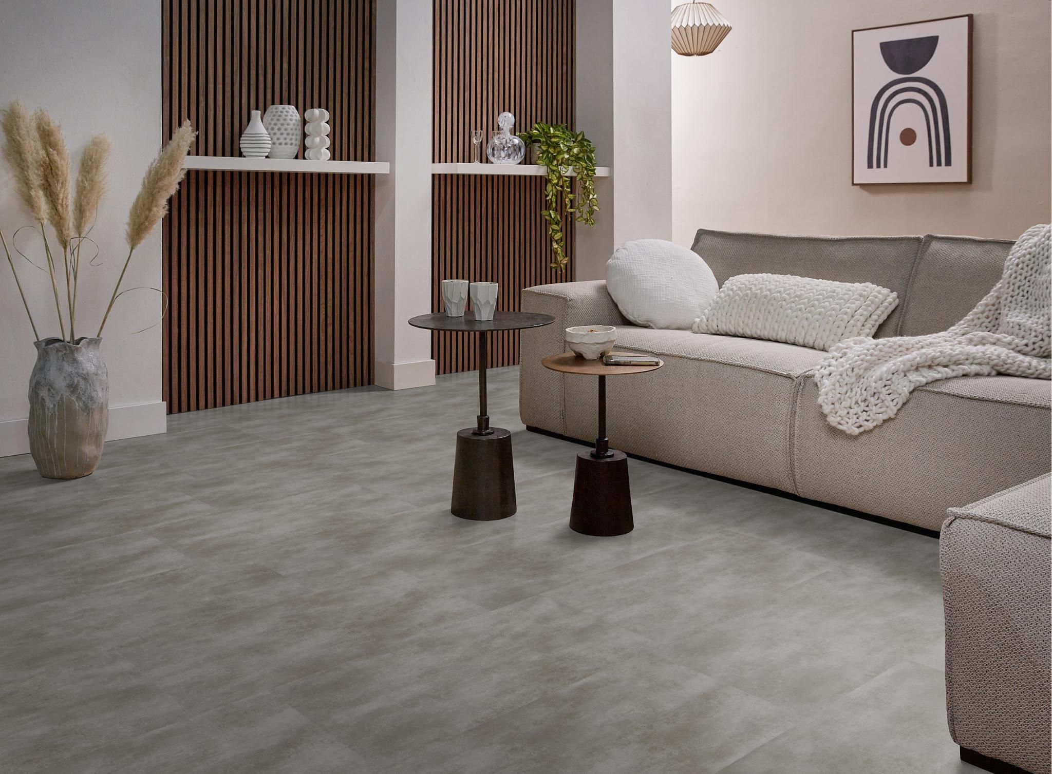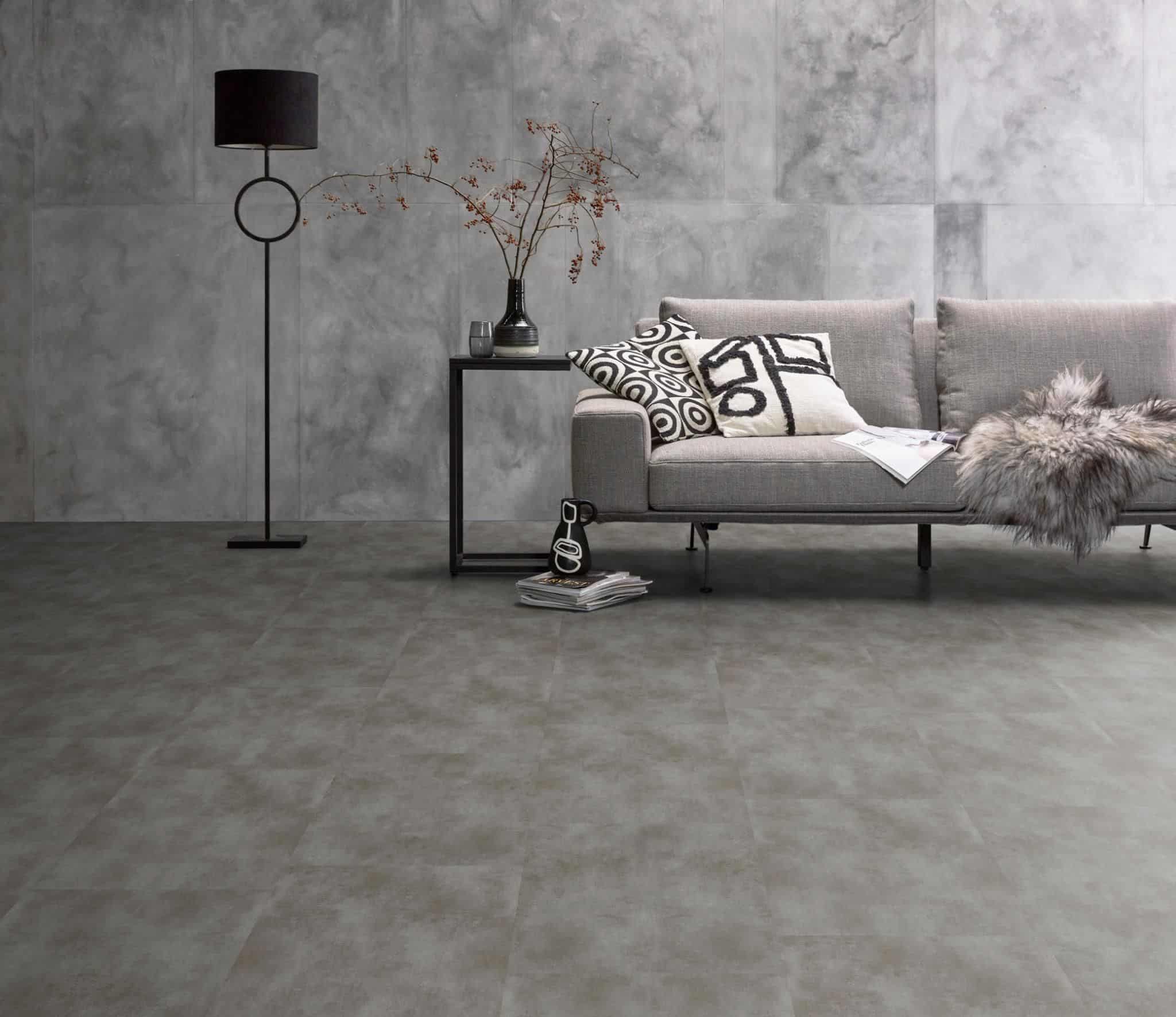 De moderne en strakke uitstraling van deze populaire betonlook vloer in extra grote uitvoering, namelijk pvc tegels van 91,4 x 91,4 cm. Met deze uitvoering creëer je een ruimtelijk effect in jouw interieur. De tegels zijn waterbestendig en mede daardoor zeer gemakkelijk in onderhoud. Met de sterke toplaag van 0.55 mm heb je jarenlang plezier van dit tijdloze dessin.