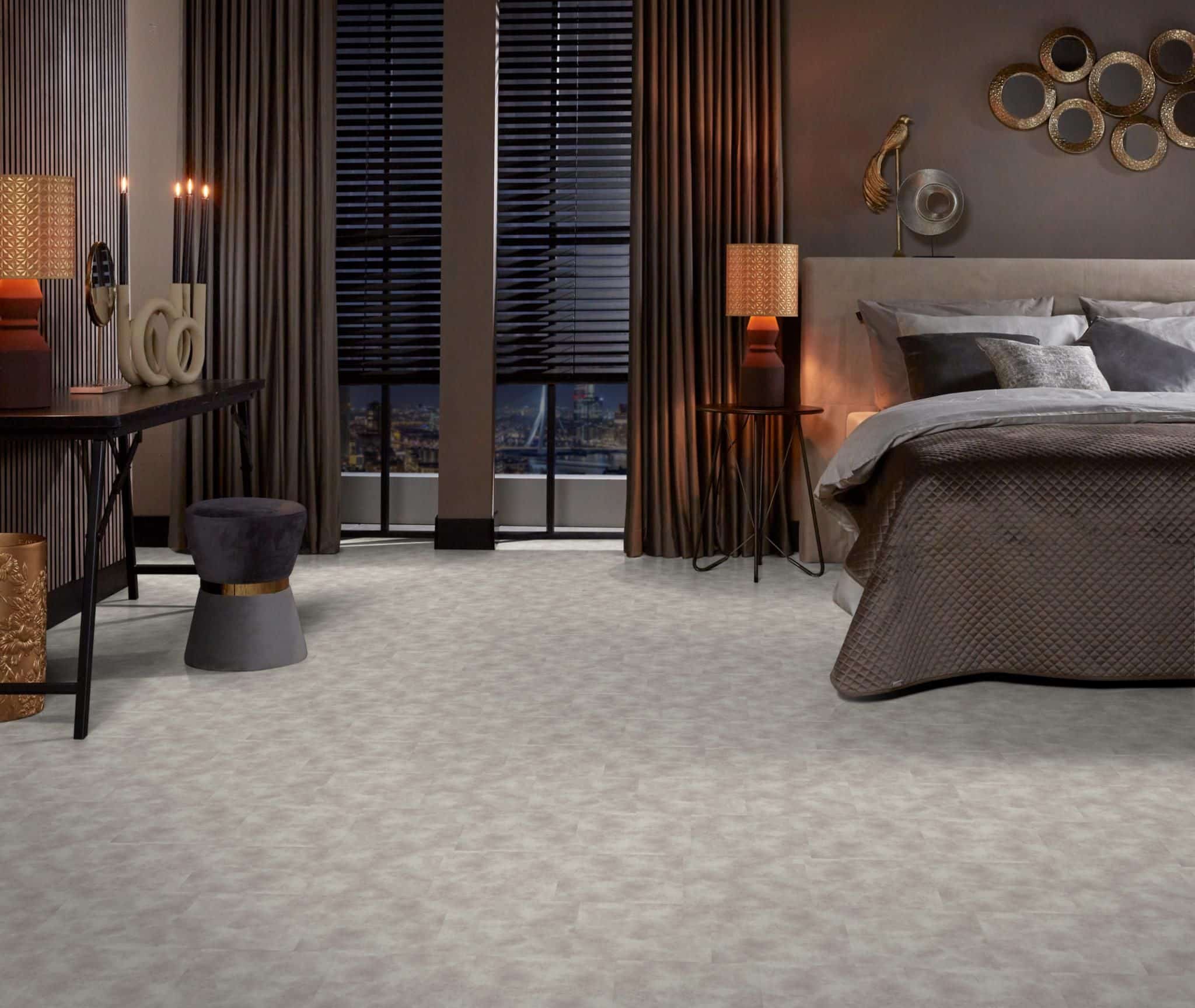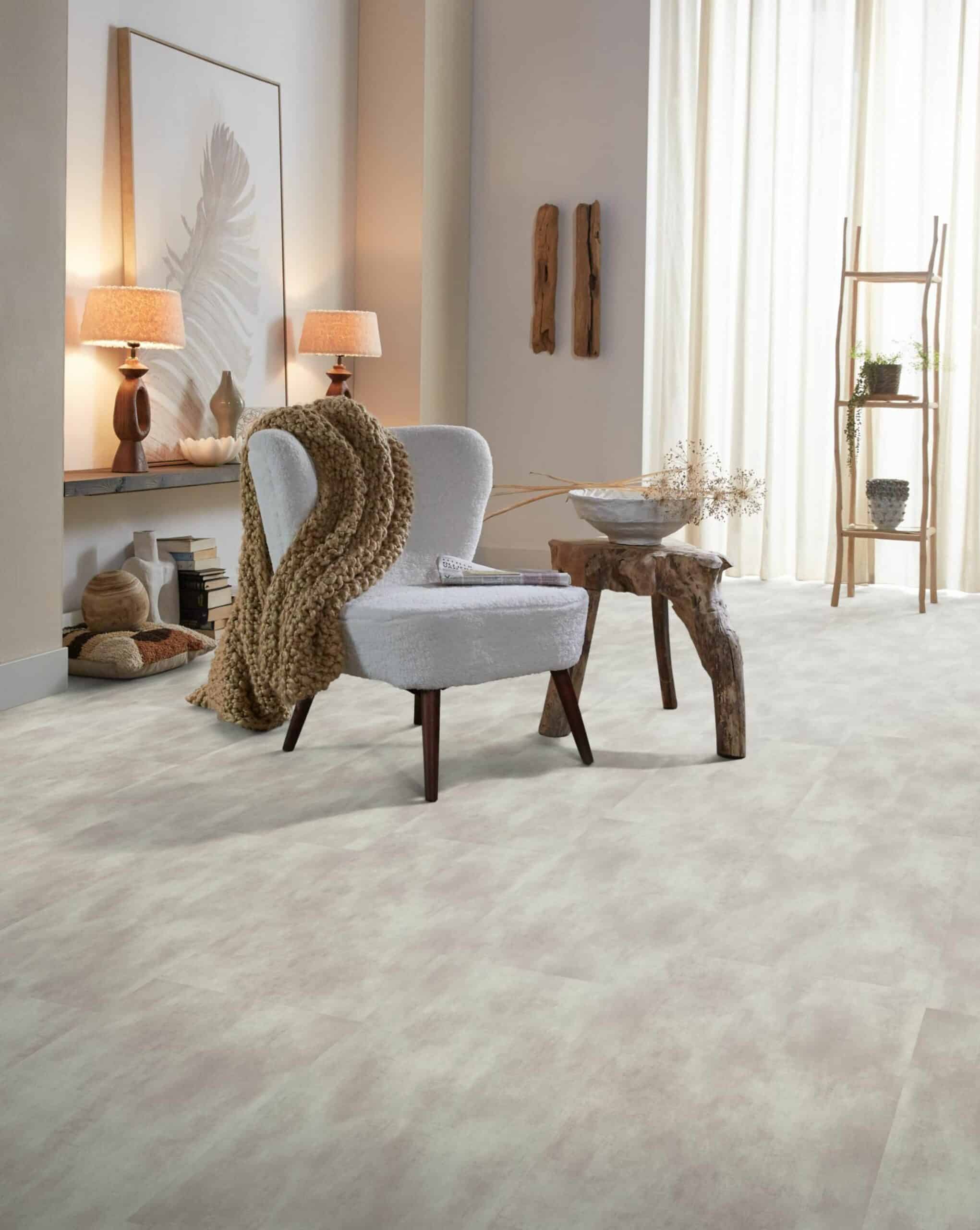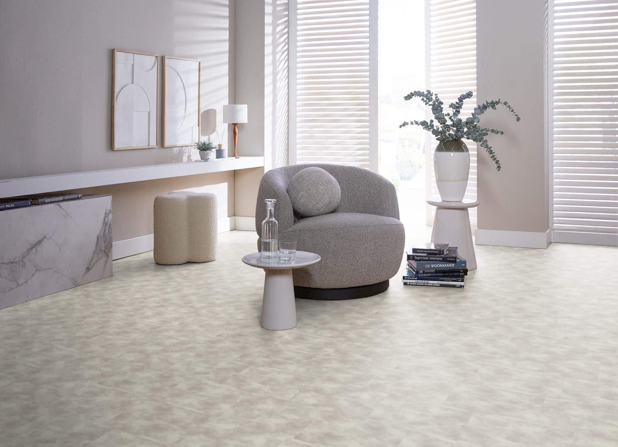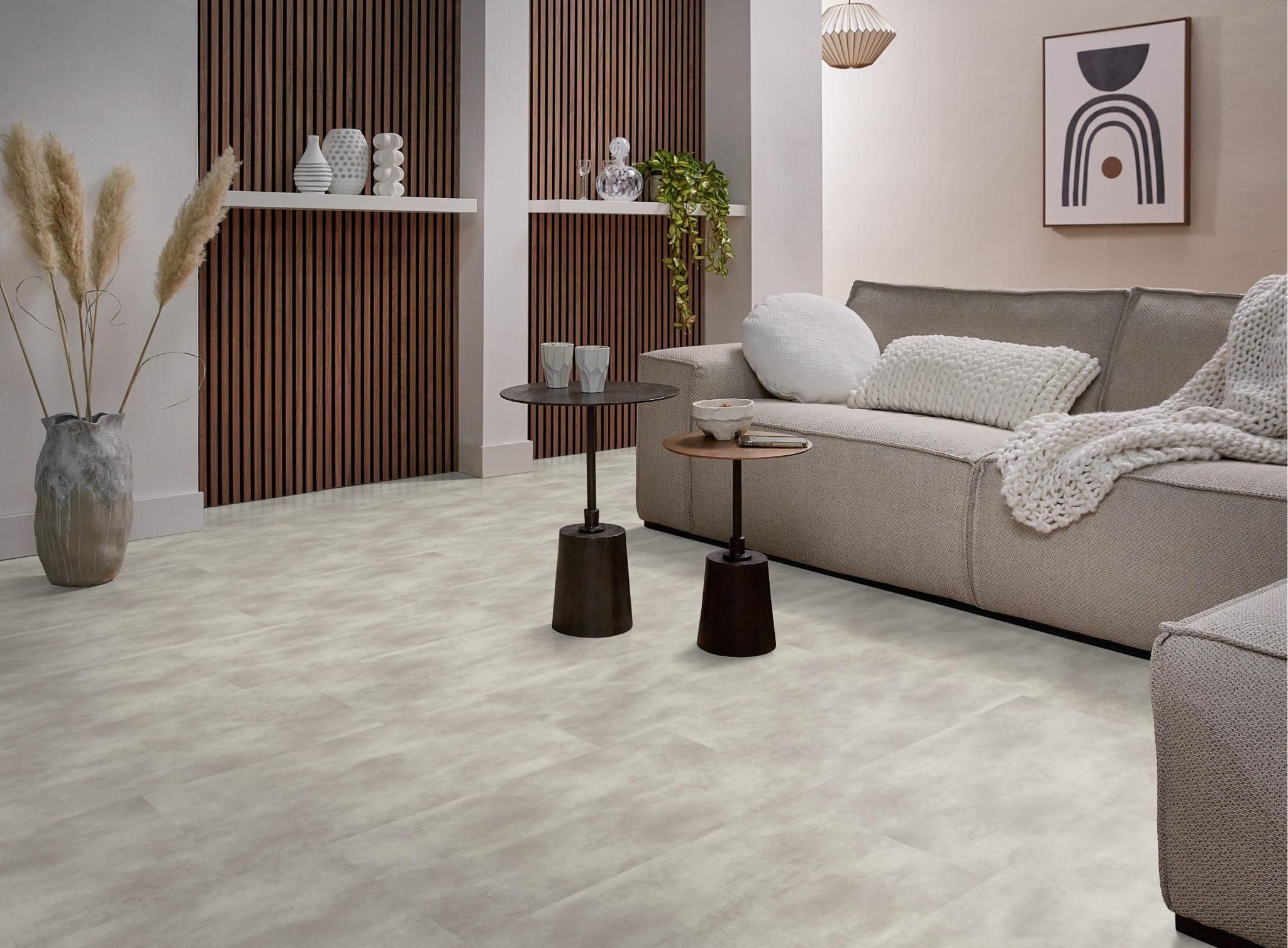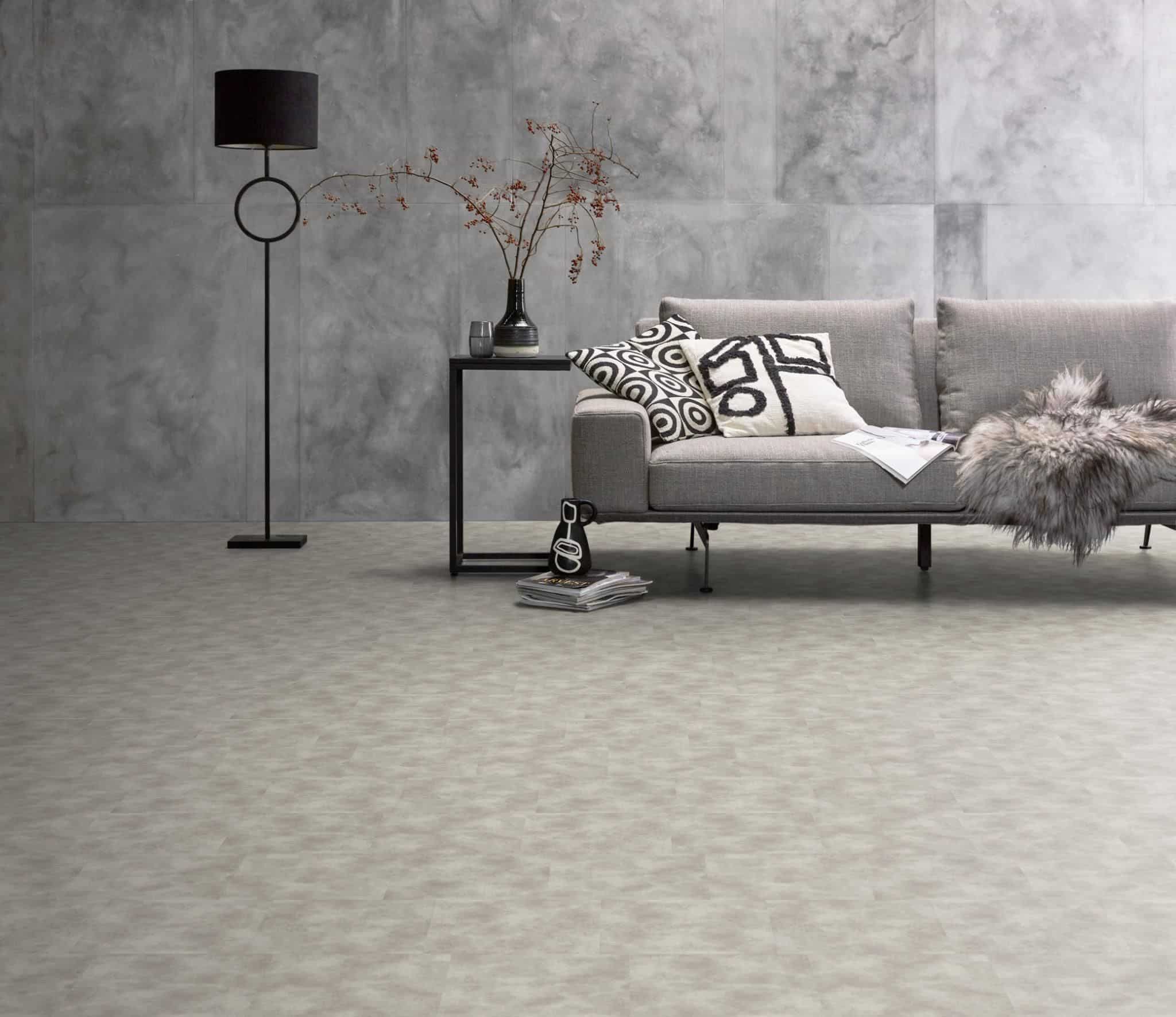 De moderne en strakke uitstraling van deze populaire betonlook vloer in extra grote uitvoering, namelijk pvc tegels van 91,4 x 91,4 cm. Met deze uitvoering creëer je een ruimtelijk effect in jouw interieur. De tegels zijn waterbestendig en mede daardoor zeer gemakkelijk in onderhoud. Met de sterke toplaag van 0.55 mm heb je jarenlang plezier van dit tijdloze dessin.