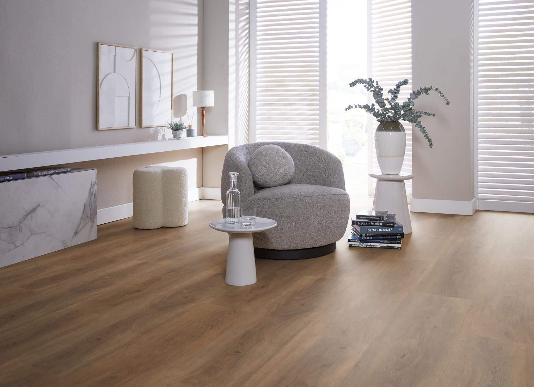 Deze prachtige pvc vloer is te herkennen aan zijn extra brede en lange planken (153 x 25,3 cm). De vloer heeft een natuurgetrouwe structuur die exact de houtprint volgt en heeft daarnaast een subtiele V-groef. Een bijkomend voordeel is dat deze pvc vloer maar weinig onderhoud nodig heeft. De click variant is voorzien van een 10dB geluiddempende onderlaag, dus een je kunt genieten van een heerlijk stille vloer!