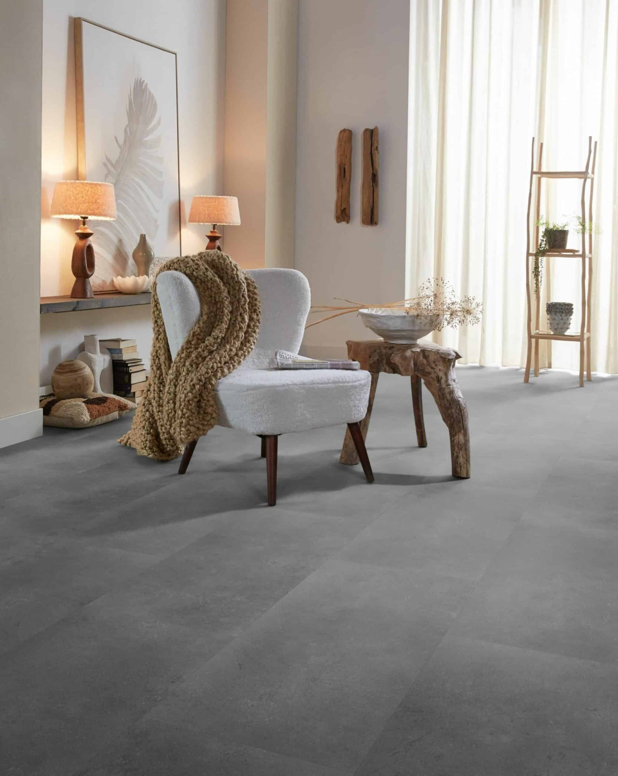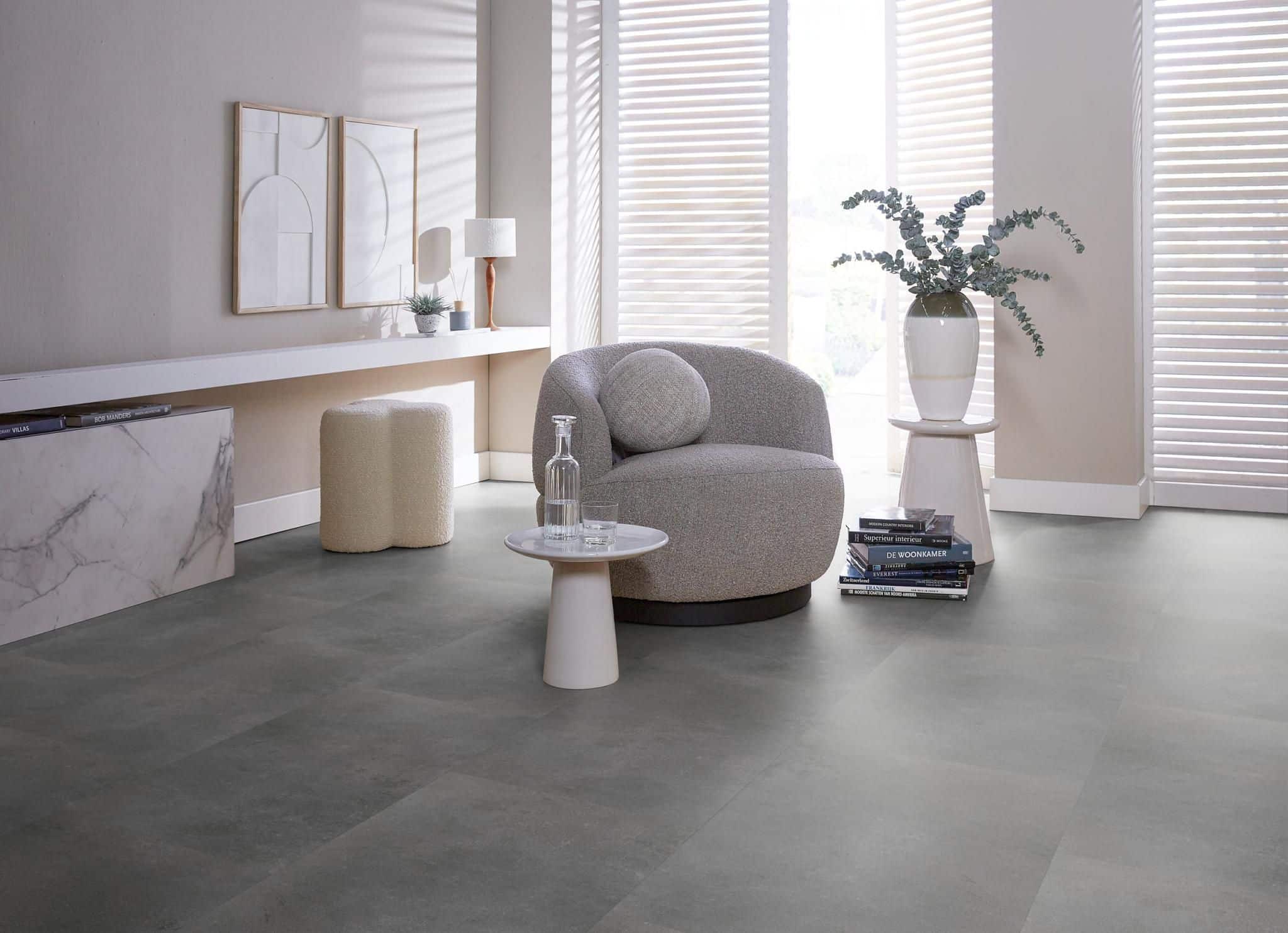 Verliefd op een betonnen vloer, maar is dit voor jouw woning helaas geen optie? De Sarino is een goed alternatief! Deze betonlook vloer is verkrijgbaar in twee tegelformaten: vierkant en rechthoekig. Daarnaast wordt deze vloer aangeboden in vier grijstinten passend bij elke woonstijl. Combineer deze pvc vloer met hout of aardetinten, voor een warme uitstraling in jouw interieur.