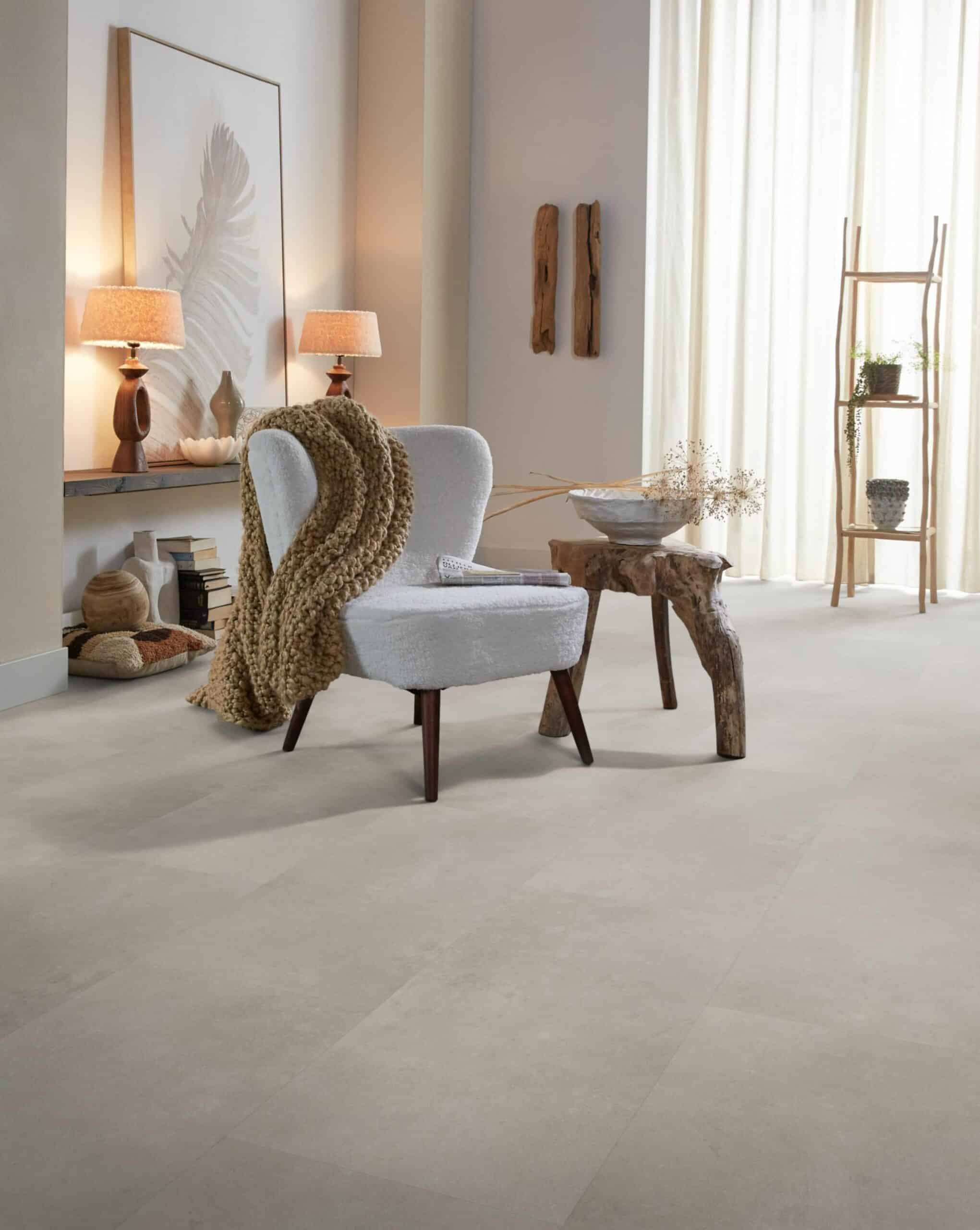 Verliefd op een betonnen vloer, maar is dit voor jouw woning helaas geen optie? De Sarino is een goed alternatief! Deze betonlook vloer is verkrijgbaar in twee tegelformaten: vierkant en rechthoekig. Daarnaast wordt deze vloer aangeboden in vier grijstinten passend bij elke woonstijl. Combineer deze pvc vloer met hout of aardetinten, voor een warme uitstraling in jouw interieur.