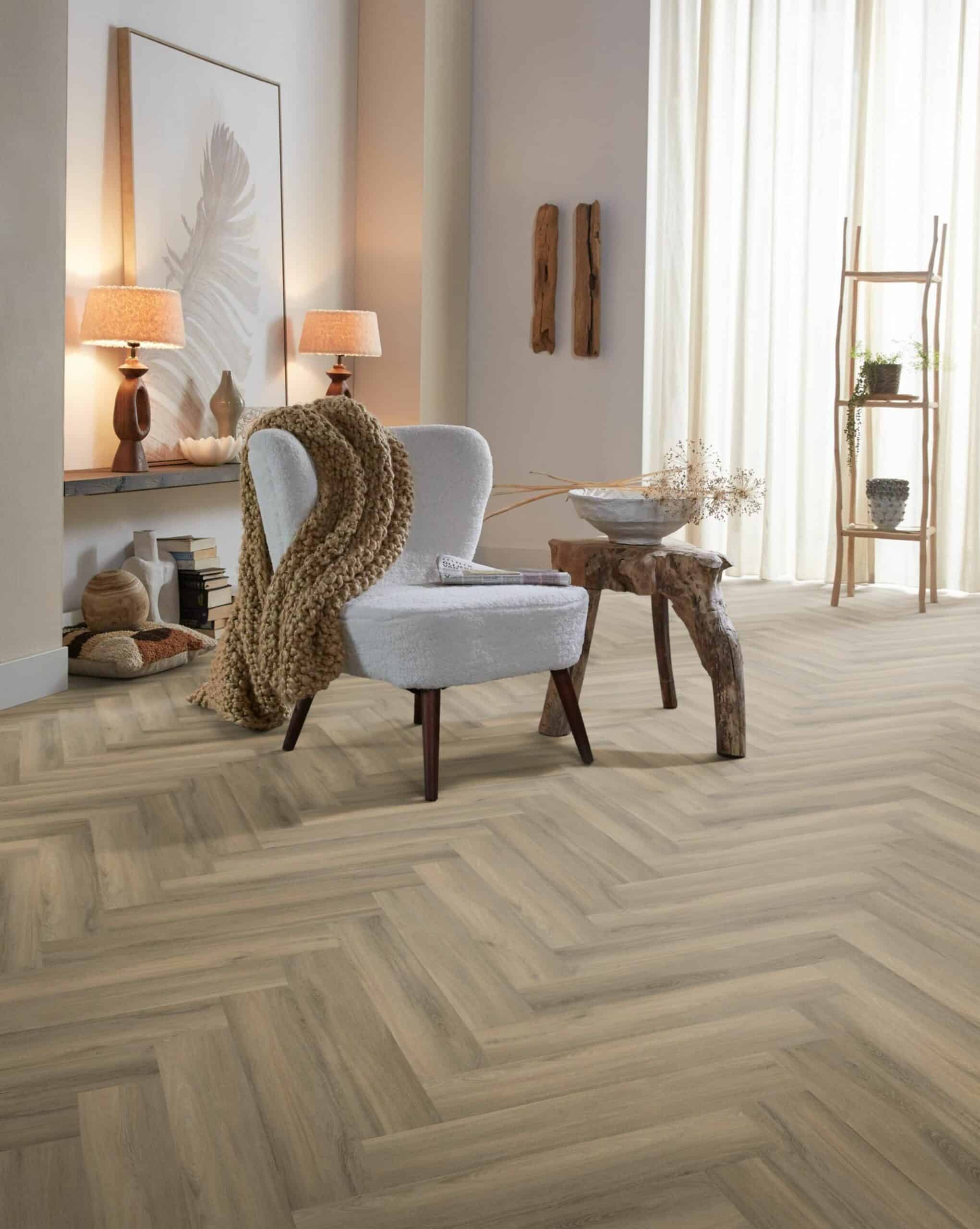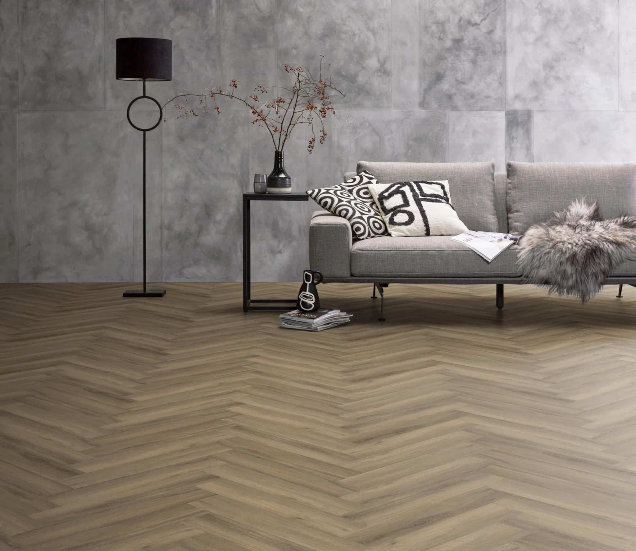 Ontdek de moderne uitstraling van visgraat pvc. Deze pvc vloer in visgraat is niet meer weg te denken uit de huidige woontrends en is nauwelijks van een houten vloer te onderscheiden, door de kleine noesten. Deze vloer is 7 mm dik en heeft een toplaag van 0.55 mm die de vloer beschermd en krasbestendig maakt. Een bijkomend voordeel: deze pvc vloer is geschikt voor appartementen vanwege de vermindering van het contactgeluid.