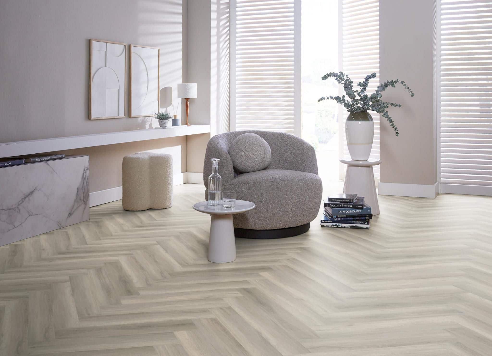 De warme en rijke uitstraling van hout is terug te vinden in deze rustige en natuurgetrouwe visgraat pvc vloer. Deze visgraat pvc vloer is verkrijgbaar in zes kleuren, variërend van beige tot donkergrijs. Voor elk interieur een passende kleur. De stroken zijn afgewerkt met een extra matte toplaag en hebben een dikte van 0,55 mm.