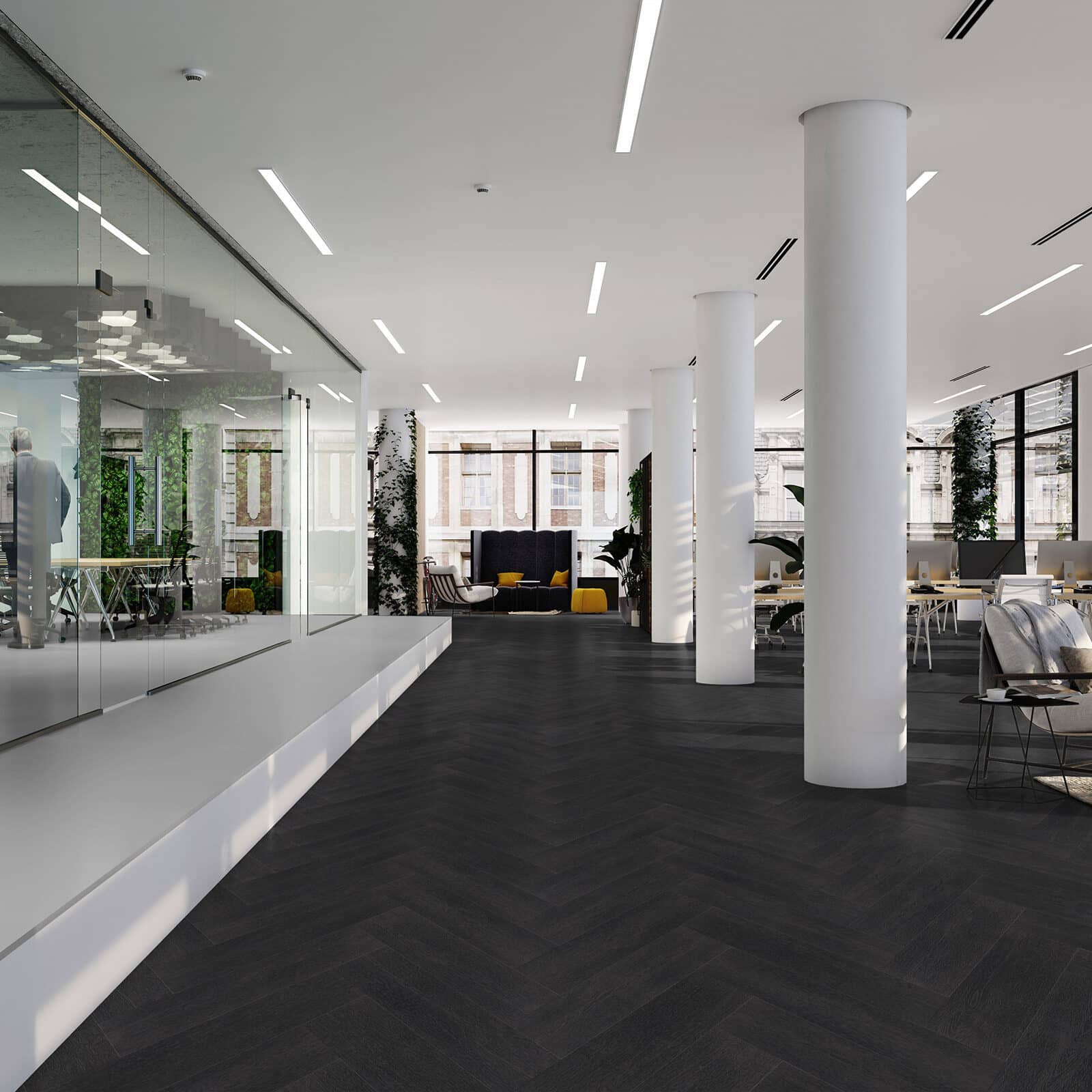 De 6930 is een bijna zwarte visgraat vloer, eventuele gebruikssporen zijn beter zichtbaar op donkere vloeren.